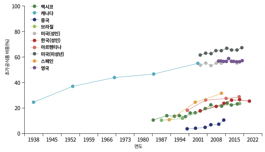 주요국의 초가공식품 섭취 비중 추이(총열량 대비)