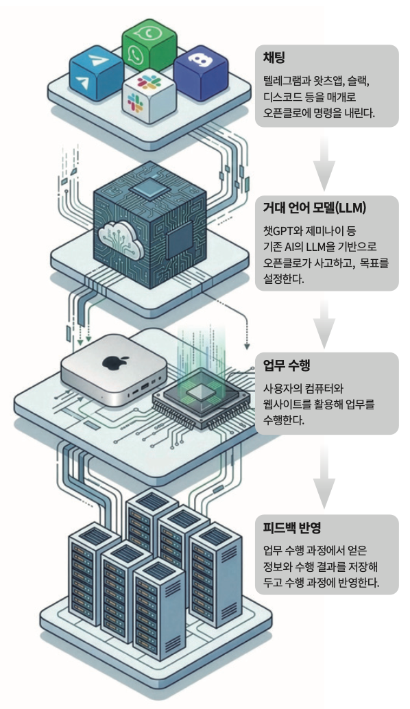 2026년 1월, 인공지능(AI) 에이전트 ‘오픈클로’가 세상에 나왔다. 오스트리아의 개발자 피터 슈타인베르거가 만든 오픈클로는 사용자 지시에 답하는 데 머물지 않는다. 사용자의 목표 달성을 위해 AI가 자율적으로 계획을 세우고, 의사 결정을 하고, 작업도 수행하는 시스템이다. 오픈클로는 2025년 11월 프로그램 개발 플랫폼인 ‘깃허브’에 코드 소스가 공개되자마자 큰 관심을 얻었다. 공개된 지 4개월 만에 깃허브의 인기 척도인 별을 25만 개 받았다. 3월 1일 기준 역대 소프트웨어 프로젝트 가운데 가장 많은 별이었다.