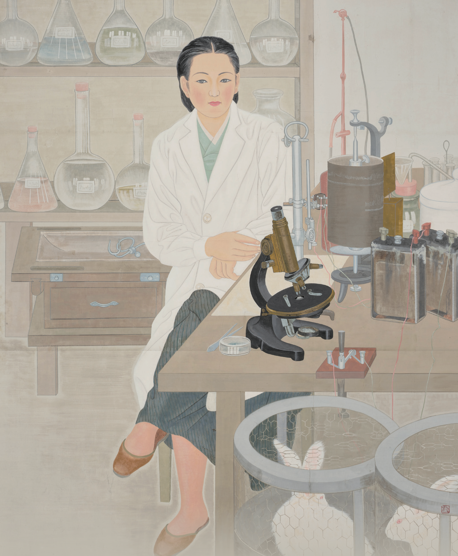 여성이 과학자가 되는 건 당시로서는 드문 일이었다. 이유태 작가의 주요 작품만 봐도 그렇다. ‘인물일대-화운’에서는 피아노 앞에 앉아있는 여성을 화폭에 담았고, ‘여인 지·감·정’ 삼부작에서는 모란 가운데 앉아있는 소녀, 아들을 안고 있는 어머니, 혼례날 신부를 그렸다. 이것이 어렵지 않게 상상할 수 있는 여성의 모습이었다.