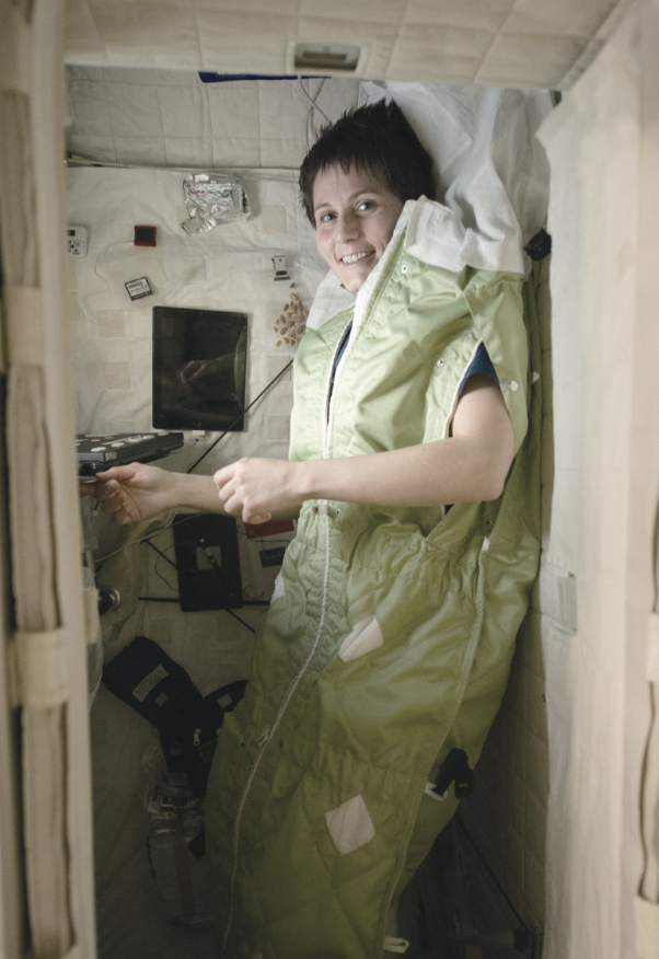 2014년 12월 6일, 유럽우주국(ESA) 소속 우주비행사 사만다 크리스토포레티가 국제우주정거장(ISS)의 개인 승무원 숙소에서 침낭 안에 들어가 있다. ESA가 꾸준히 연구 중인 동면 기술이 상용화되면, 향후 심우주 여행에 활용될 가능성이 크다.