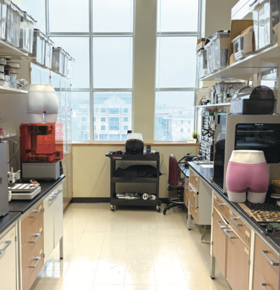 브렌틀리 홀 교수팀의 연구실. 여기저기 엉덩이 모양의 마네킹에 팬티가 씌워진 모습이 특이하지만, 실제로는 스마트 팬티를 제작하는 연구 현장이다.