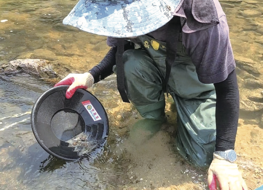 유튜브 ‘오디사금’ 채널을 운영하는 김종현 씨가 하천에서 사금을 채취하고 있다. 손에 든 검은 그릇은 사금을 채취할 때 사용하는 ‘패닝 접시’다.