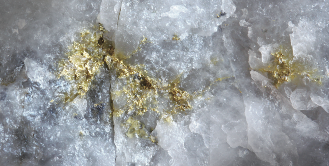 한국의 금광맥은 대개 흰색 석영맥 속에 있다. 사진은 석영 사이에 껴 있는 금이다.