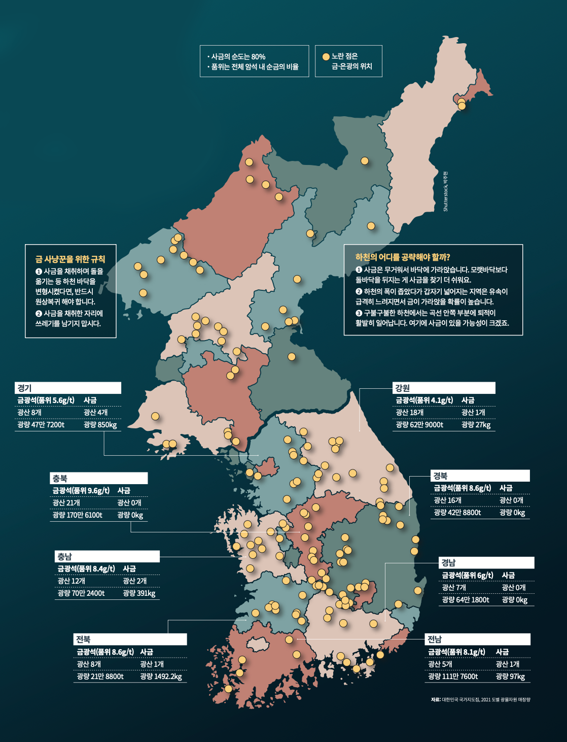 어디로 가야 금을 많이 만날 수 있을까요. 대한민국 국가지도집에 수록된 주요 금속 광물 자원 분포도에서 금·은광의 위치를 찾아봤습니다. 한국광해광업공단이 2021년 발표한 도별 광물자원 매장량 현황을 함께 표시했습니다.